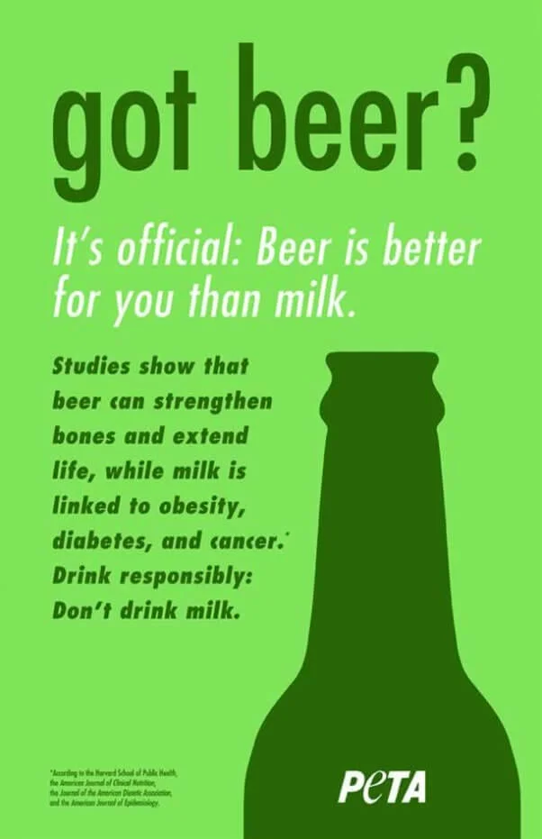 Now, PETA is using this fun little nugget of history as the basis for a new campaign: Beer is Healthier for You Than Milk. The campaign was heavily criticized at the University of Wisconsin-Madison, where they replaced ‘Got Milk?’ signs with ‘Got Beer?’ Not like anyone is surprised.